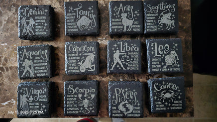 Laser engraved slate coasters featuring all twelve zodiac signs with individual characteristics. Each coaster displays a distinct astrological symbol paired with its defining traits—from Aries' bold determination to Pisces' intuitive nature. Crafted from quarried slate, these pieces offer superior moisture absorption and lasting durability. The natural stone surface develops a subtle patina over time, enhancing its character. Whether you're an astrology devotee or seeking meaningful home décor, this comprehensive set celebrates the zodiac's rich symbolism while protecting your surfaces with understated sophistication.